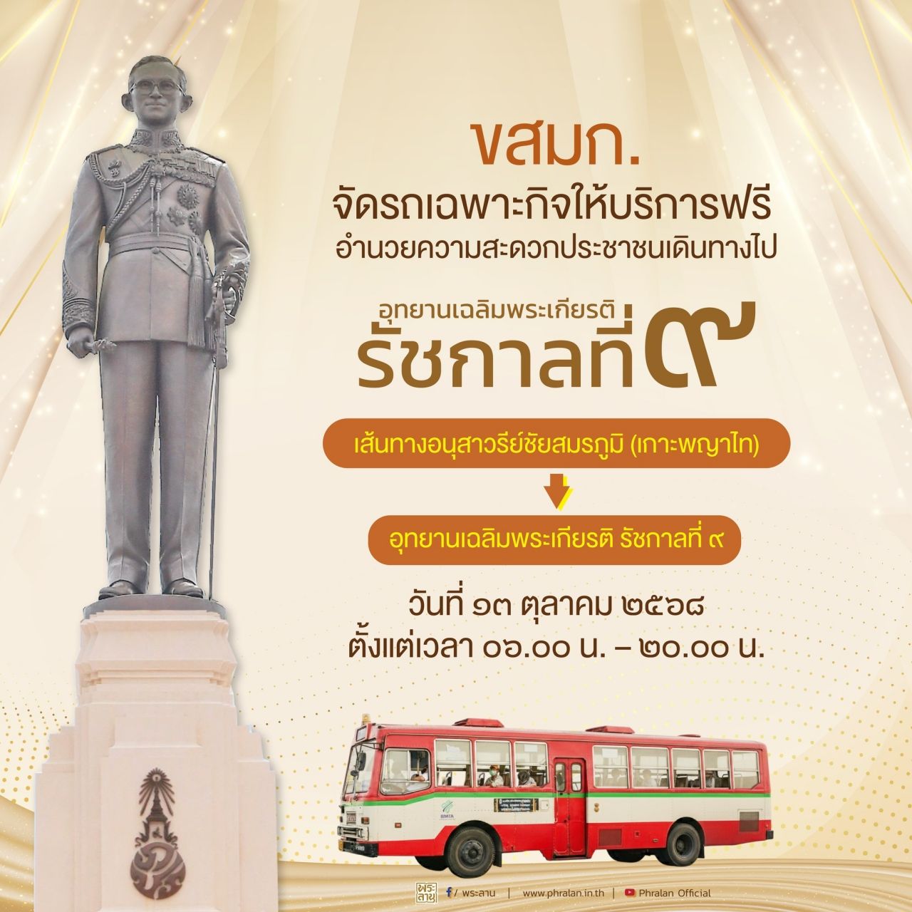 “รัฐบาลเชิญชวนประชาชนสักการะพระบรมราชานุสาวรีย์ “ในหลวงรัชกาลที่ 9” ณ อุทยานเฉลิมพระเกียรติ ร.9 วันนวมินทรมหาราช 13 ต.ค. 68 จัดรถและเรือรับ-ส่งฟรี”